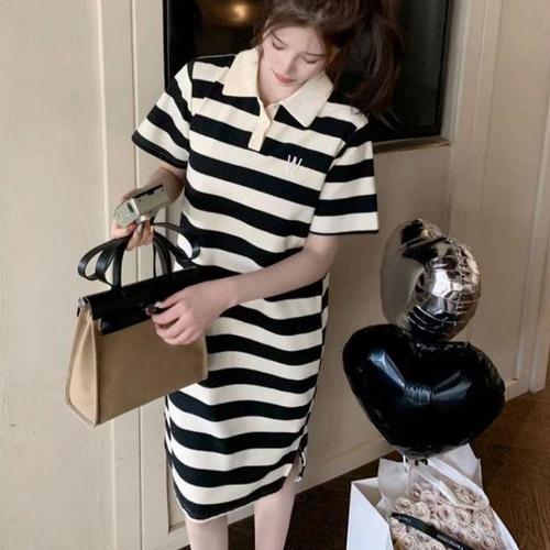카라 포인트 스트라이프 반팔 롱원피스 여름 데일리룩