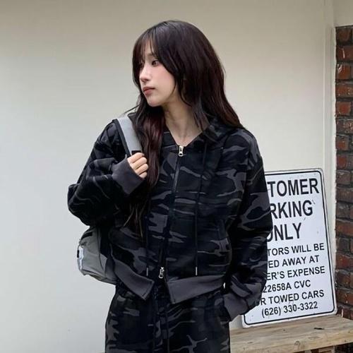 [디자이너몰]여성 카모플라쥬 세미 크롭 기모 후드 집업