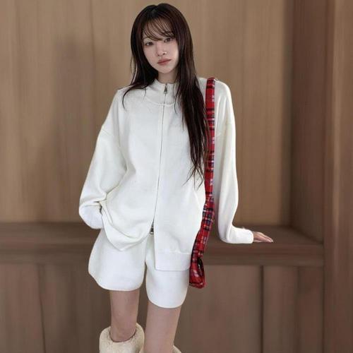 [미라클세븐]여성용 겨울 하이넥 니트 집업과 숏팬츠 트레이닝 세트