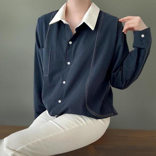 [미라클세븐]여성 스티치 배색 칼라포켓 면셔츠