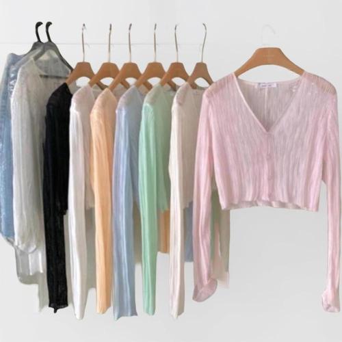 [미라클세븐]여성 시스루 세미크롭 긴팔 가디건 무지컬러 여리핏