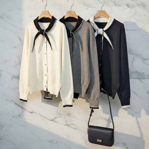 [미라클세븐]여성용 버튼 라인 배색 3종 컬러 스카프 가디건