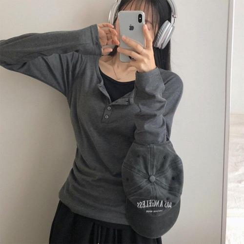 [미라클세븐]여성 셔링 디자인 슬림핏 레이어드 컬러 버튼 긴팔 티셔츠