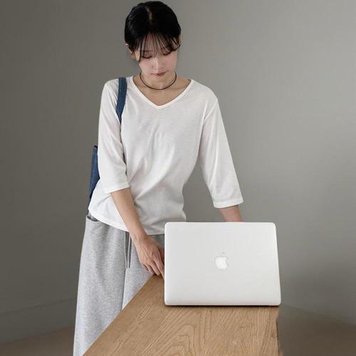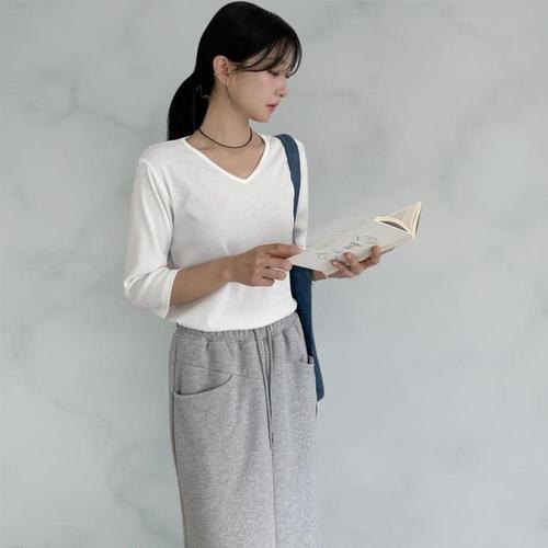 [미라클세븐]여성 무지 컬러 스판 골지 브이넥 8부 티셔츠