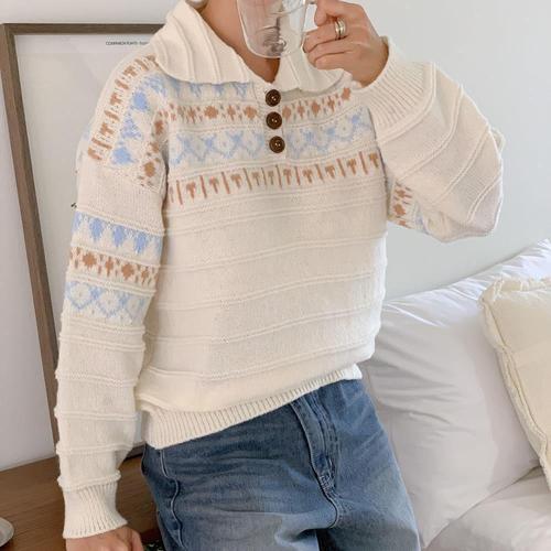 [미라클세븐]여성 스트라이프 컬러 배색 버튼 카라 오버핏 니트