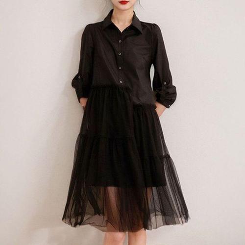 [에이치플러스몰]블랙 카라넥 언발 망사 캉캉 플레어 원피스 유니크룩