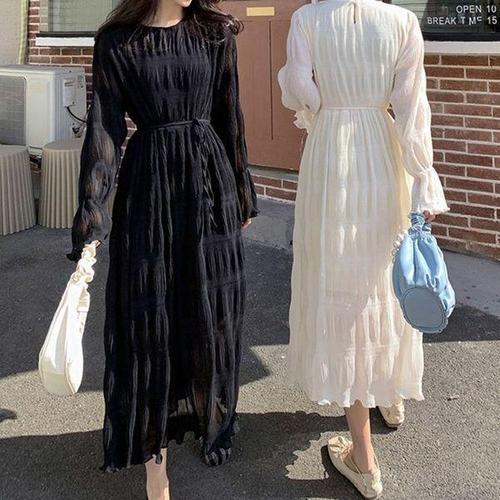 [에이치플러스몰]주름 캉캉 롱원피스 스트링 안감 포멀룩 가로줄 여성