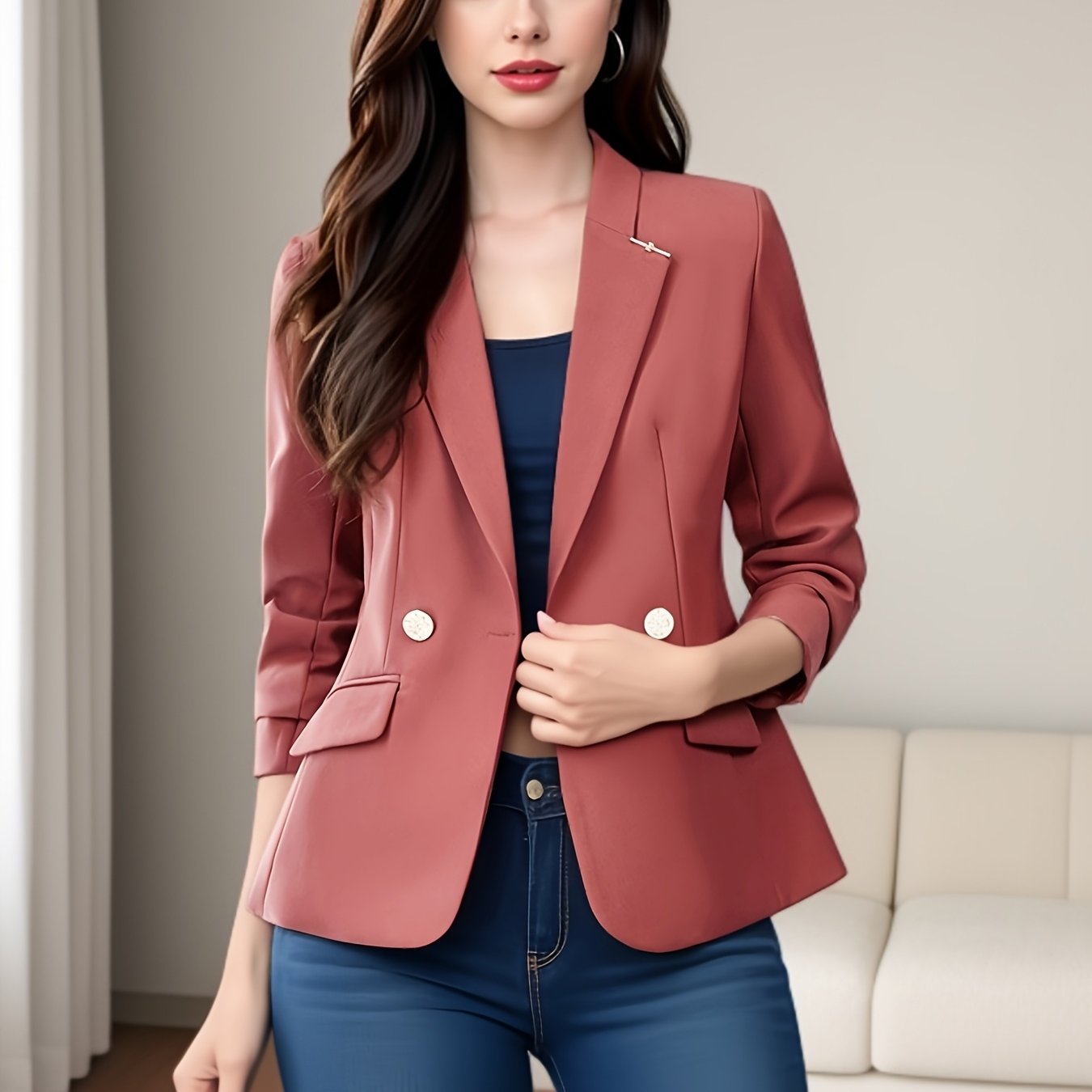 TEMU 여성용 브릭 레드 패딩 , 2024년 가을/겨울 신상 스타일, 소녀스러운 여성용 테일러드 숏 캐주얼 슈트