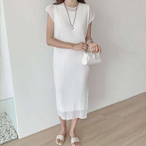 [옷자락]여성 여름 무지 컬러 플리츠 캡소매 롱 원피스