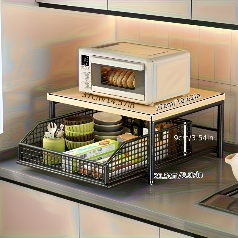 TEMU 공간절약형 주방 정리대 - 서랍 & 오픈 와이어 바스켓 포함, 내구성 강한 캐스트 아이언 스타일 금속 구조, 컴팩트 카운터탑 선반 (커피메이커, 전자레인지, 양념류, 주방용품 보관), 무전원 사용 가능, 모던 디자인, 아파트 및 사무실 주방 필수품, 현대적 설계, 견고한 제작|전자레인지