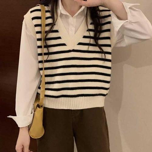 여자 대학생 캠퍼스 룩 간절기 스트라이프 니트 조끼