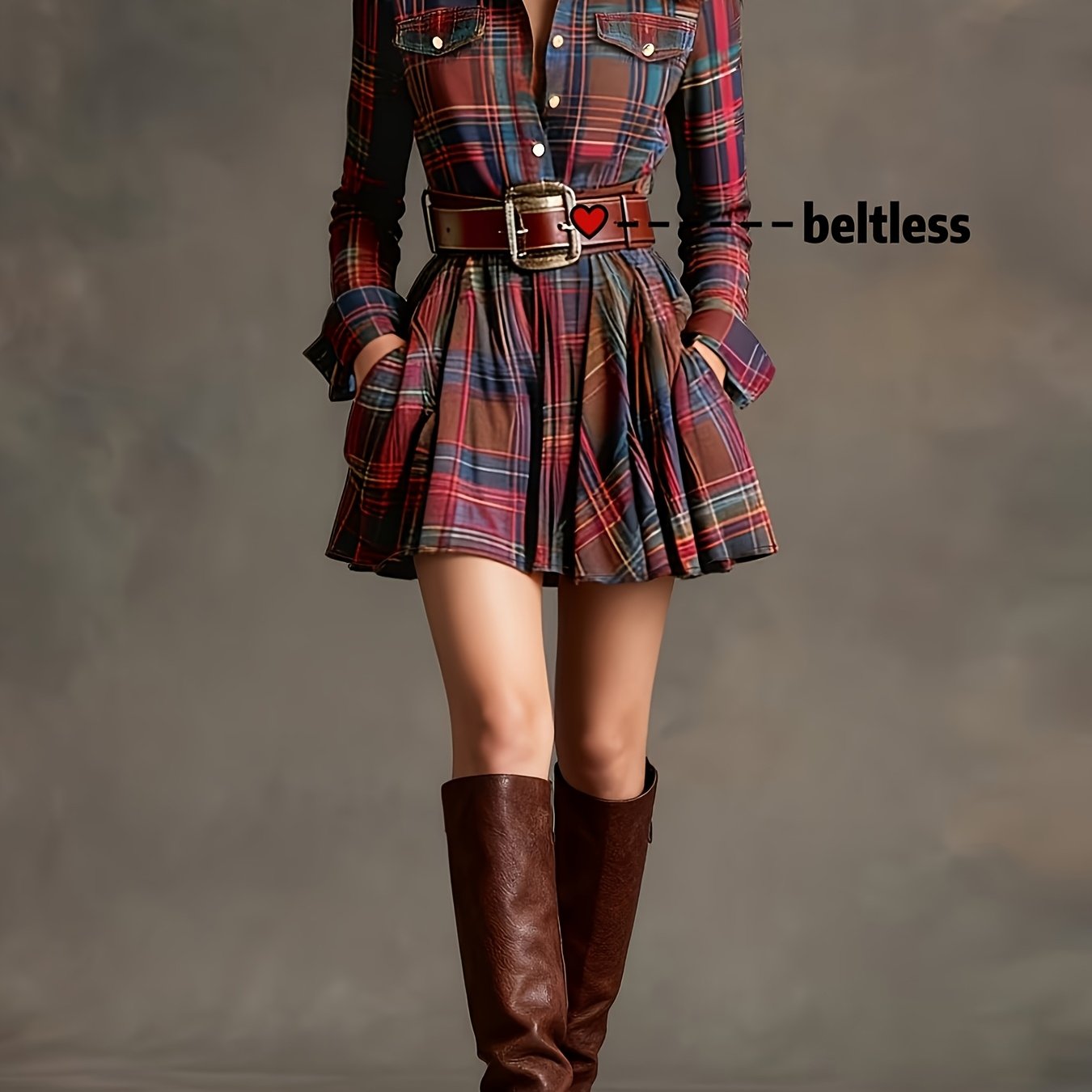 TEMU 여성용 우아하고 세련된 멀티컬러 체크 빈티지 숏 드레스, 허리 조임 디자인, 스타일리시한 버튼업 슬림핏 칼라 셔츠 드레스, 모임과 파티에 완벽한 선택. 벨트 미포함|여성원피스|드레스
