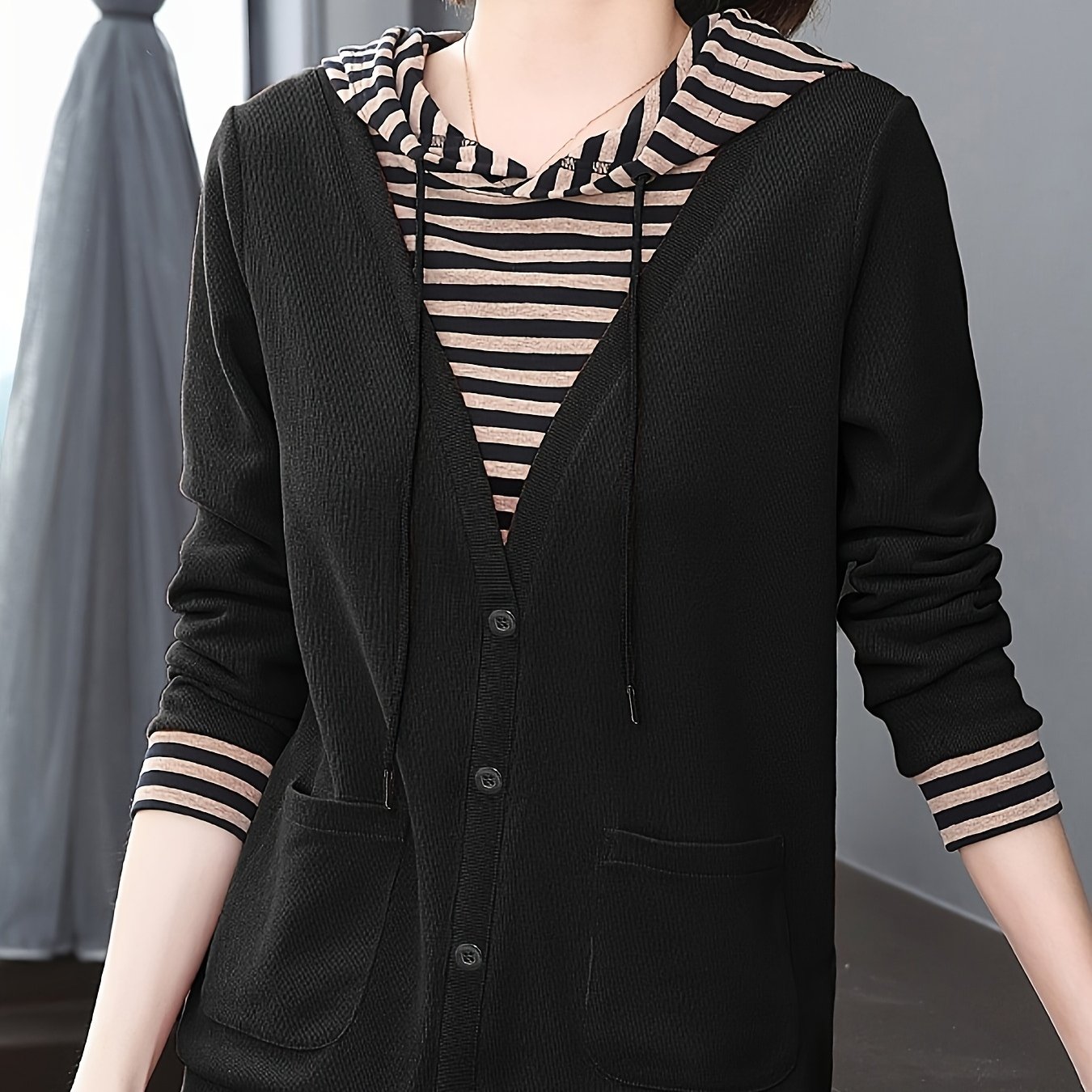 TEMU 여성 패치워크 후드티 - & 가로 , 긴소매 캐주얼 풀오버, 버튼 앞면, 올 시즌 레이어링 필수템, 다용도 의류, 트렌디 패션, 패션 애호가