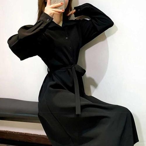 [셀러허브_여성트랜드패션]ONM 여성 허리 스트랩 올블랙 카라넥 롱원피스 코드st