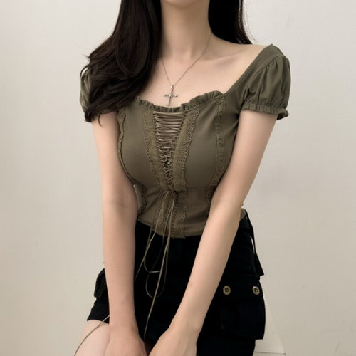 입꼬 / 프린센스 올리브 코르셋 레이스 셔링 반팔 블라우스