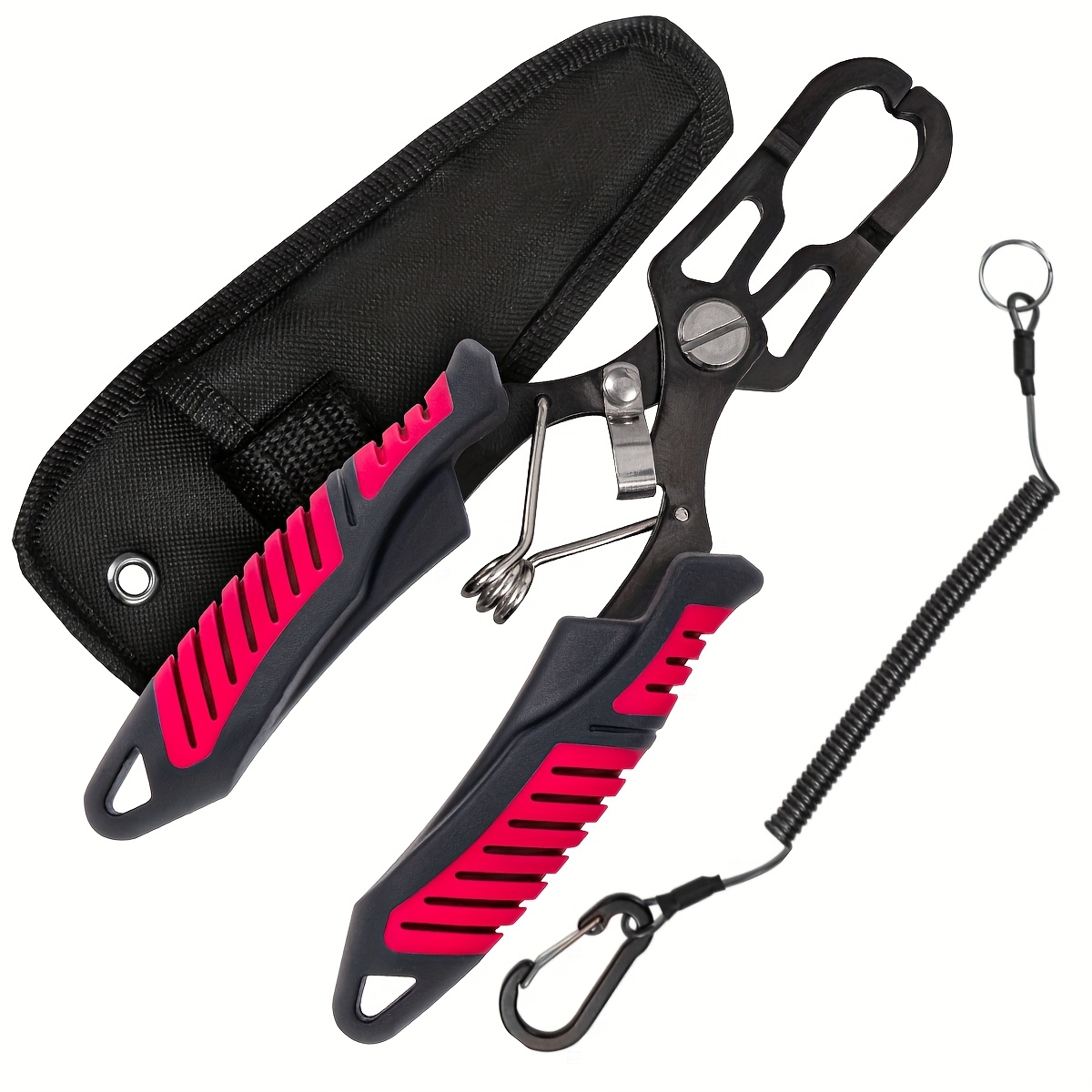 TEMU 미끄럼 방지 핸들 & 내장형 라인 커터가 있는 헤비듀티 낚시 플라이어 - 멀티컬러 (빨강/초록/파랑/분홍/노랑) 헤비그립 루어 도구, 훅 제거기 & 휴대용 가위 모양 도구, 보관 가방 & 끈 포함 (전원 필요 없음)
