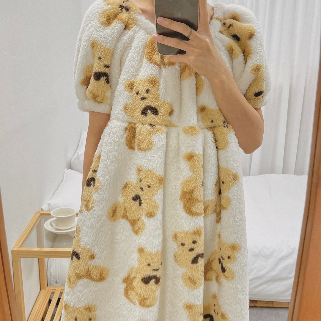 TEMU 귀여운 곰돌이 프린트 파자마 세트 | Zramiwo 빈티지 레이스 스쿱넥 긴팔 잠옷, 성인용, 편안한 봄/여름 홈웨어