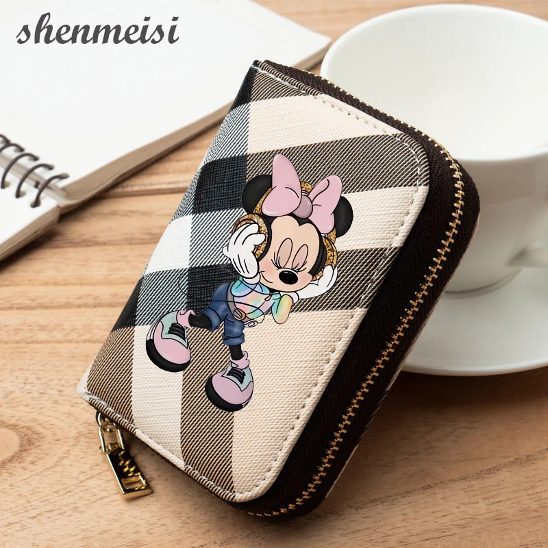 디즈니 미키 마우스 격자 무늬 패턴 지갑 만화 미니 마우스 짧은 PU 가죽 지퍼 동전 지갑 인쇄 카드 슬롯 여성 선물
