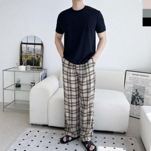 [에이치플러스몰]겨울바지 시원 밴딩 와이드 쿨소재 여름 팬츠 체크 남자 핀턱