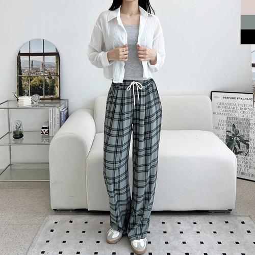 [옷자락] 여자 여름 쿨소재 찰랑 체크 와이드 밴딩 팬츠