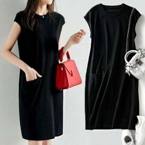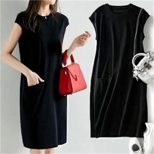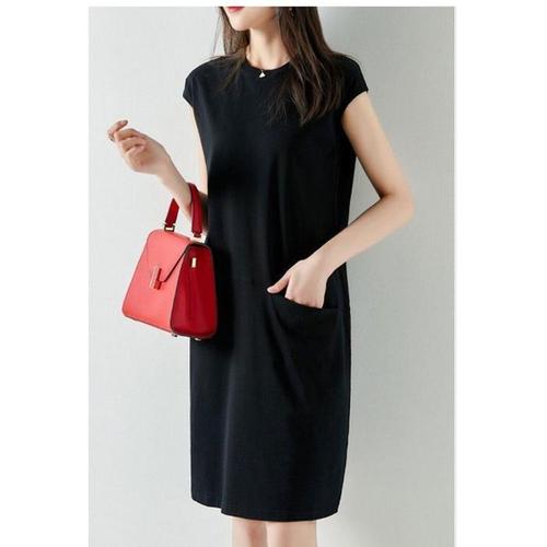 여성 사이드 포켓 쿨소재 허리셔링 A라인 반팔 미디 원피스 CL-WOP0286