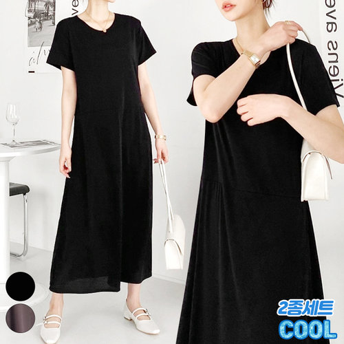 [2종세트] 가비진 여성용 시원한 쿨소재 스판 에이라인 반팔 롱 원피스 치마