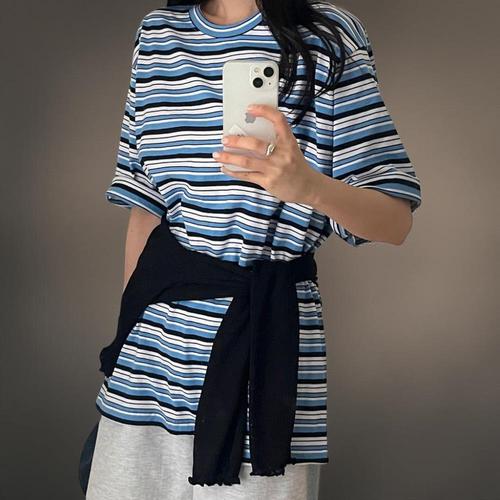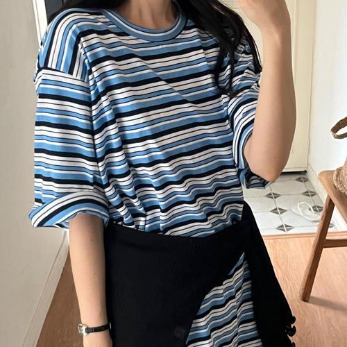 |KST946F|여성 쿨 라운드 티셔츠 스트라이프 아방핏 배색 디자인