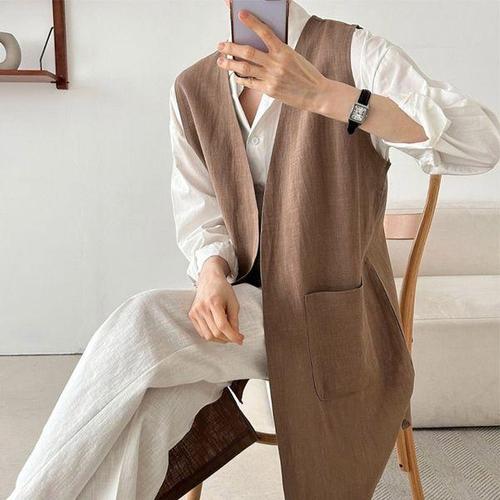 [삐까삐까]빅사이즈 브이넥 레이어드 오픈 린넨 롱 베스트 여름 자켓 조끼 국내제작