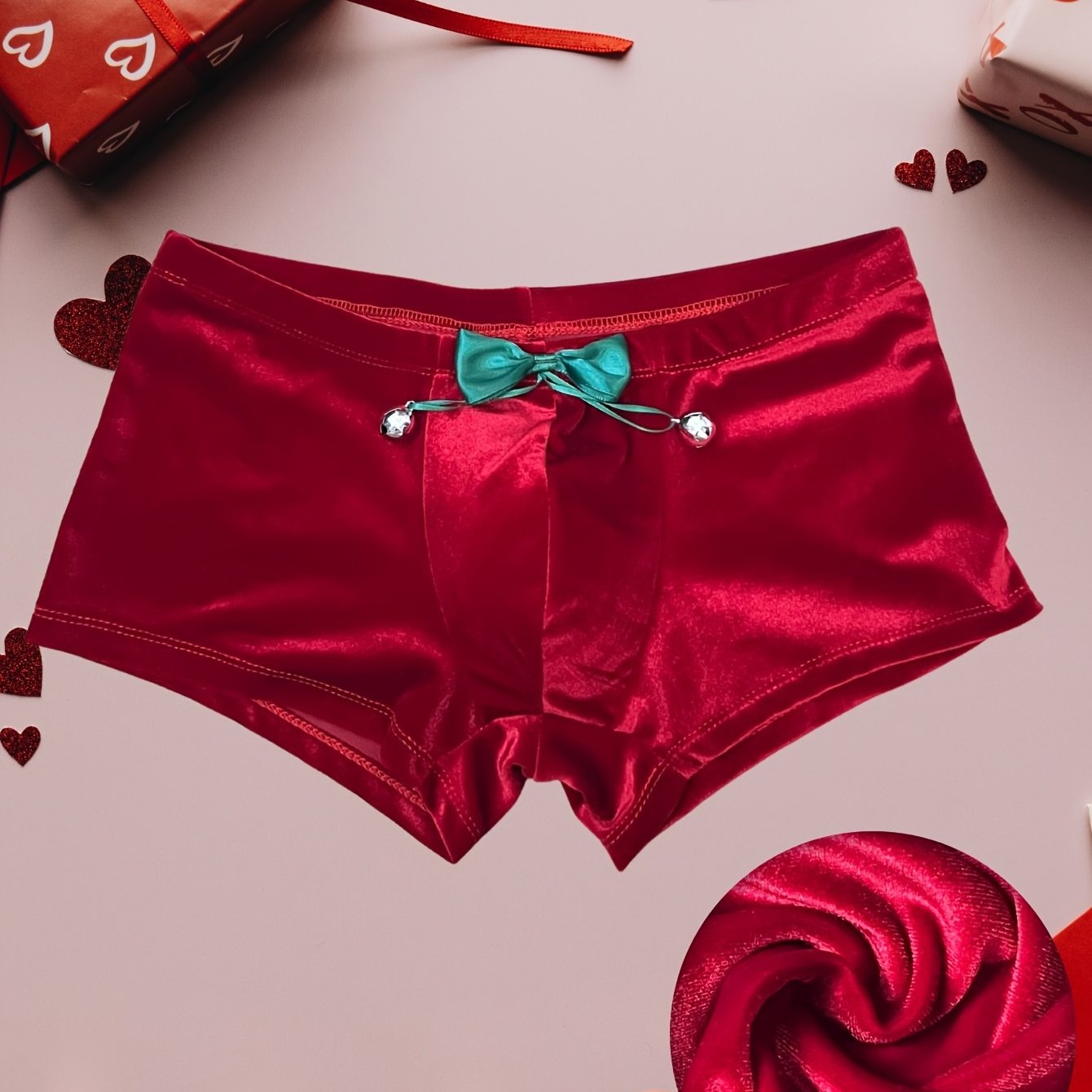 TEMU 남성용 고품질 벨벳 섹시 브리프 - 리본과 벨 장식, 연한 베이지 색상, 편안하고 섬세한 착용감, 마스커레이드 파티나 데이트 나이트에 완벽한 선물