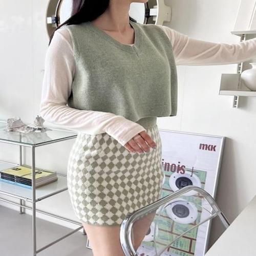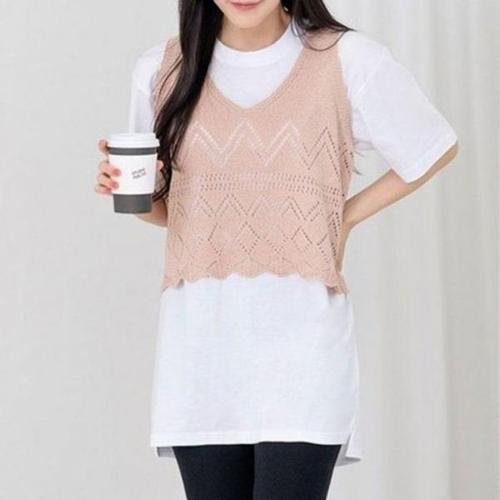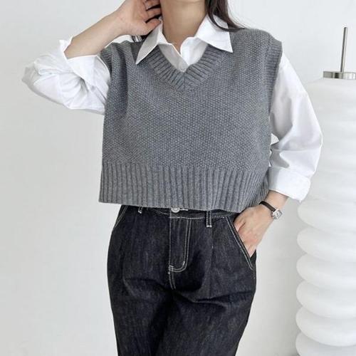 여성 브이넥 세미크롭 니트 조끼 레이어드 뜨개 원단