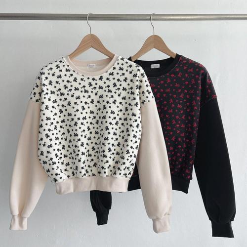 [옷자락] 여성 꽃무늬 잔골지 크롭 오버핏 퍼프 맨투맨 겨울