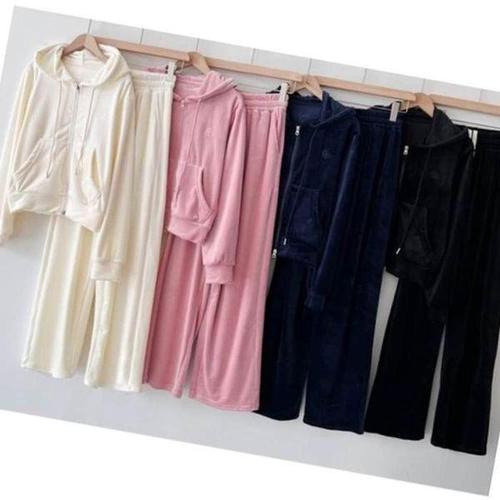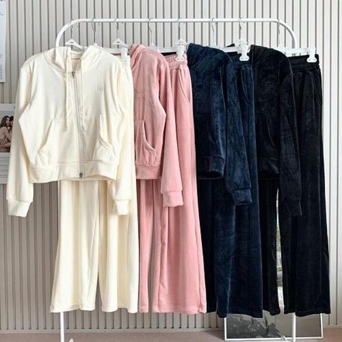 [기모/셋업] 벨벳 후드크롭 집업 와이드세트 꾸안꾸 겨울 트레이닝세트 와이드팬츠 벨로아 퍼안감 데일리룩