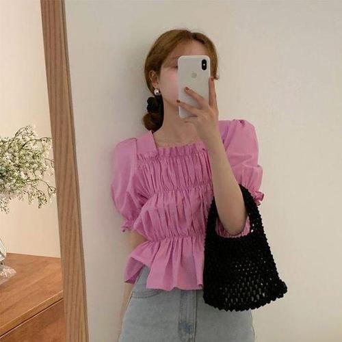 [셀러허브_여성트랜드패션]ONM 스퀘어넥 셔링 크롭 블라우스 퍼프 반팔 페플럼