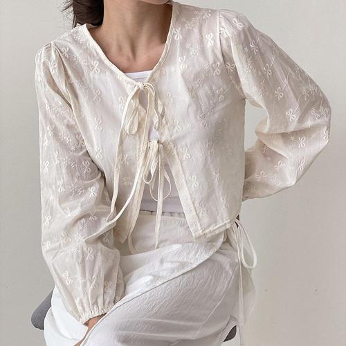 [옷자락]여자 러블리 시스루 리본 크롭 퍼프 데이트룩 가디건