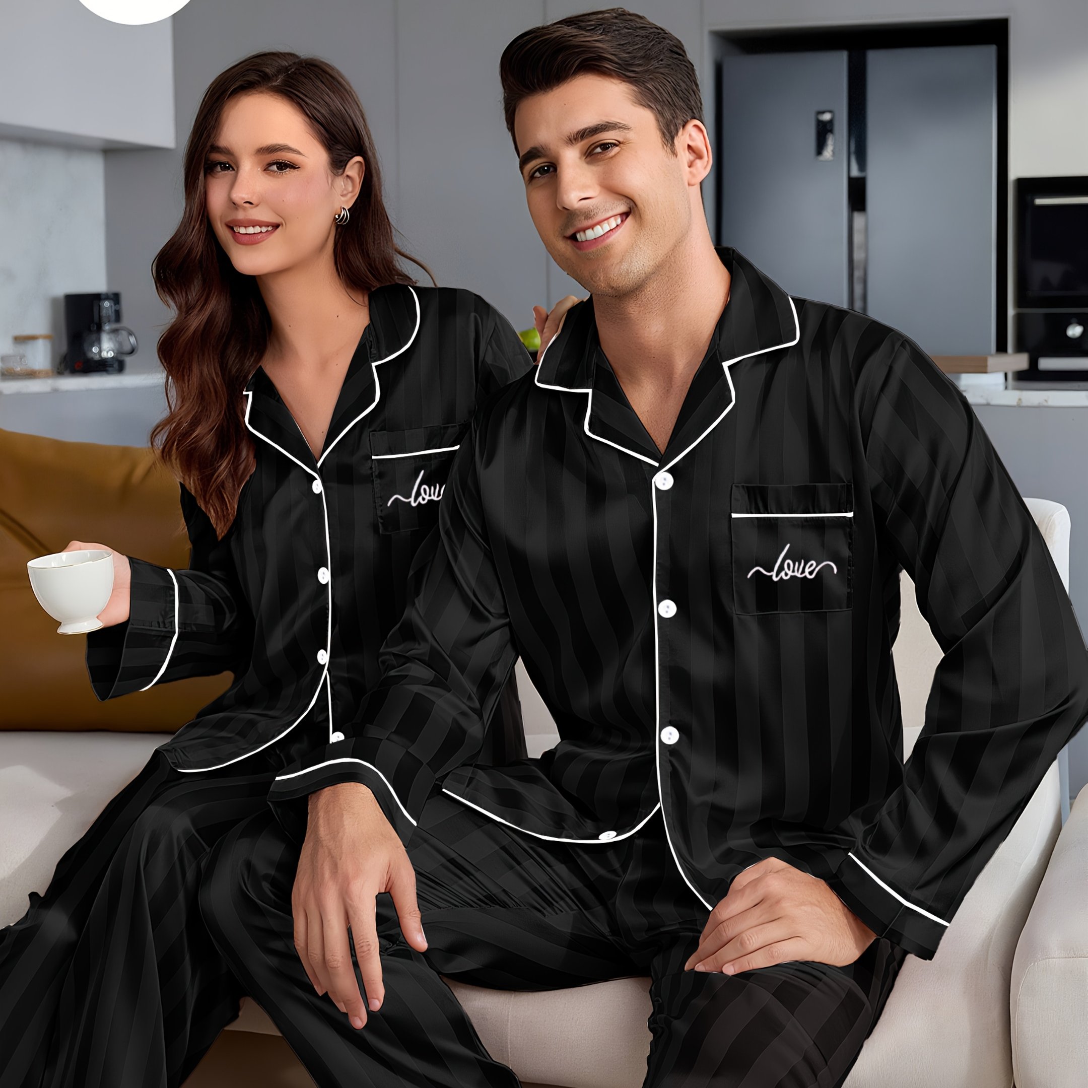 TEMU 한 세트 가격: 커플용 긴팔 프린트 파자마 세트, 블랙 오픈 프론트 버튼 상의와 긴 바지, 단품