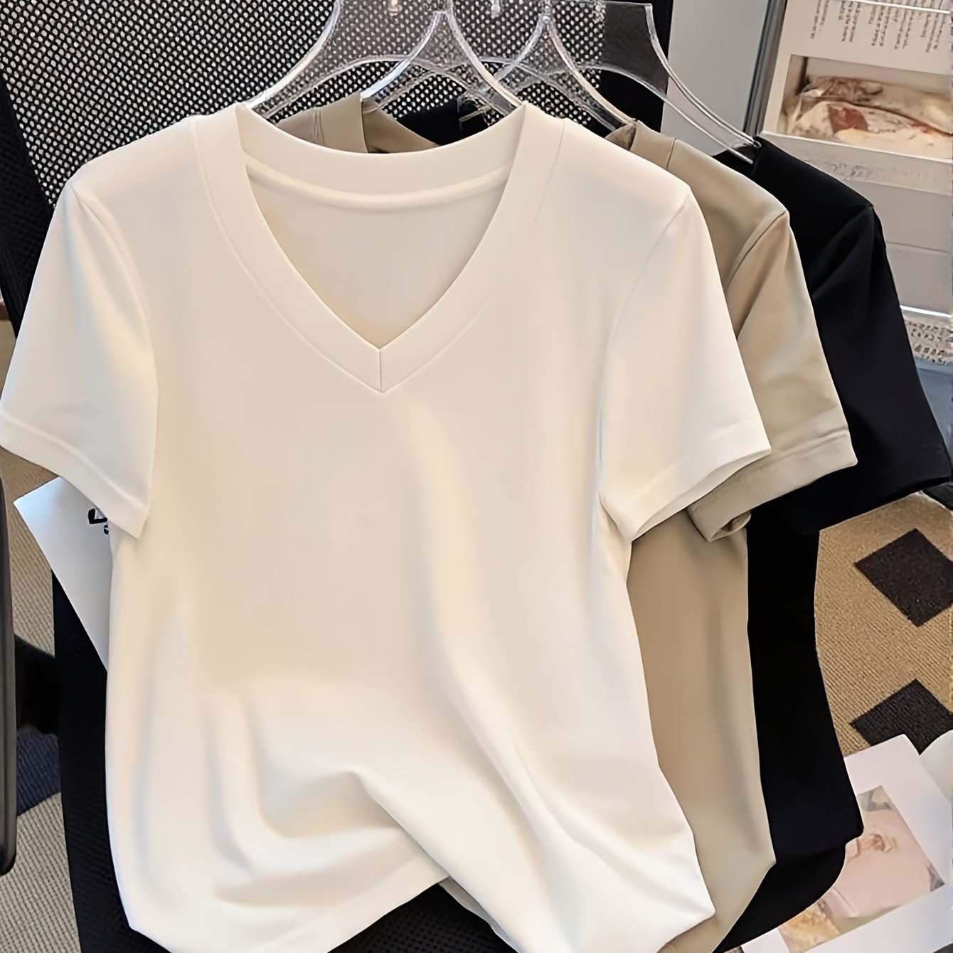 TEMU 여성용 단색 V넥 반팔 캐주얼 티셔츠 3종 세트
