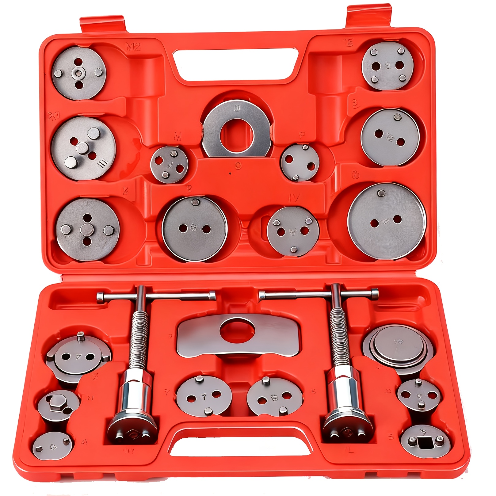 TEMU 24피스 헤비듀티 스틸 디스크 캘리퍼 피스톤 압축기 도구 세트 (18개 어댑터, 듀얼 핸드 스러스트 볼트, 리테이너 플레이트 및 장갑 포함) - 미국, 유럽, 일본 차량 대부분 호환 패드 교체용