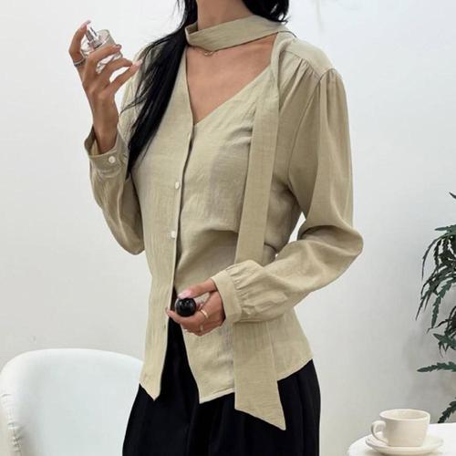 [신상오픈런]여자 하객룩 큐빅 롱타이 스카프 콩단추 긴팔 블라우스