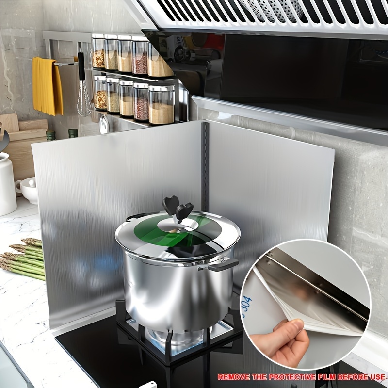 TEMU 1개 조절 가능한 스테인리스 스틸 스프래시 가드 - 접이식 4면 주방 오일 실드, 프라이팬 및 요리용 이상적, 쉬운 설치, 캐비닛 및 카운터탑 보호, 스토브 탑 가드 | 조절 가능한 스프래시 가드 | 세련된 메탈릭 마감, 스토브 탑 프로텍터