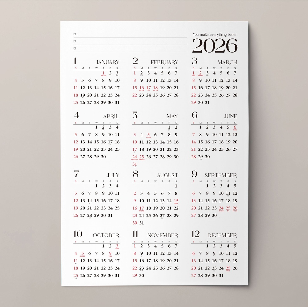 2025 2026 캘린더 한장 달력 인테리어 포스터 벽꾸미기 블랙