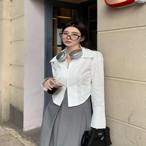 [에이치플러스몰]여자 화이트카라 투웨이 지퍼 긴팔셔츠 남방 봄 가을