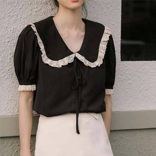 TEMU 대비되는 레이스 잠금 아이 컬라 스캘럽 트림 셔링 디테일 블라우스