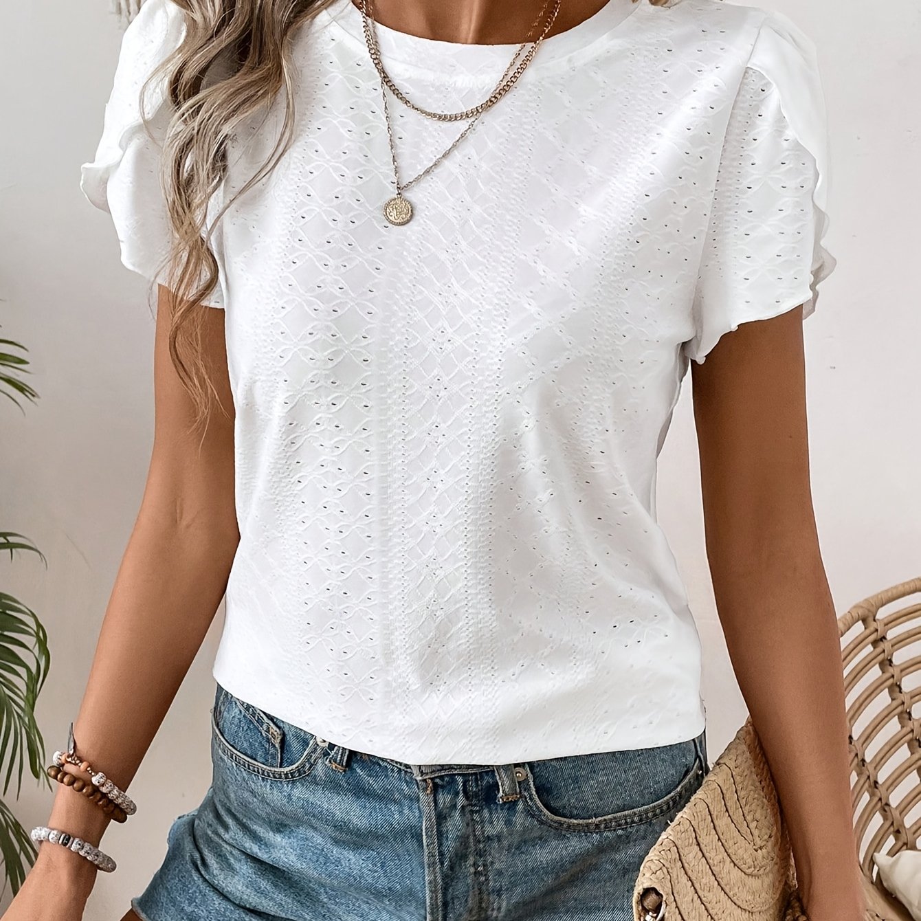 TEMU 여성용 우아한 반팔 꽃무늬 티 - 라운드 넥, 단색 화이트, 플리츠 디자인, 가벼운 폴리에스테르, 봄/여름 캐주얼 착용에 완벽, 봄/여름 상의 | 라운드 넥라인 셔츠 | 가벼운 소재