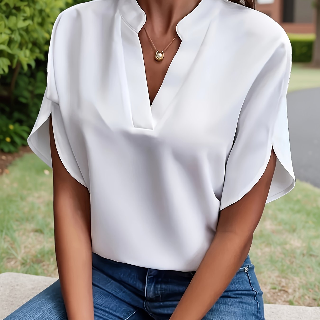 TEMU 봄 여름 가을 심플 캐주얼 커뮤터 셔츠, 솔리드 컬러 배트윙 슬리브 풀오버 셔츠, 여성용 중동 스타일 엘레강트 시리즈 루즈 V넥 반팔 셔츠 - 솔리드 컬러, 세탁기 사용 가능, 사계절 다용도 캐주얼 및 포멀 탑, 가벼운 소재