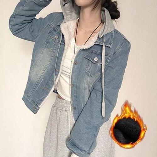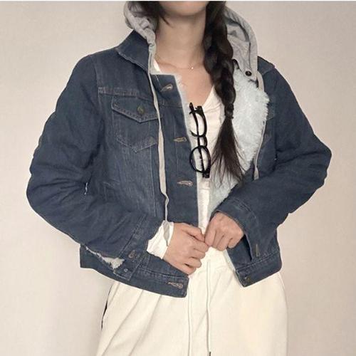 [에이치플러스몰]편안한 후드 데님자켓 여성용 따뜻한 털안감