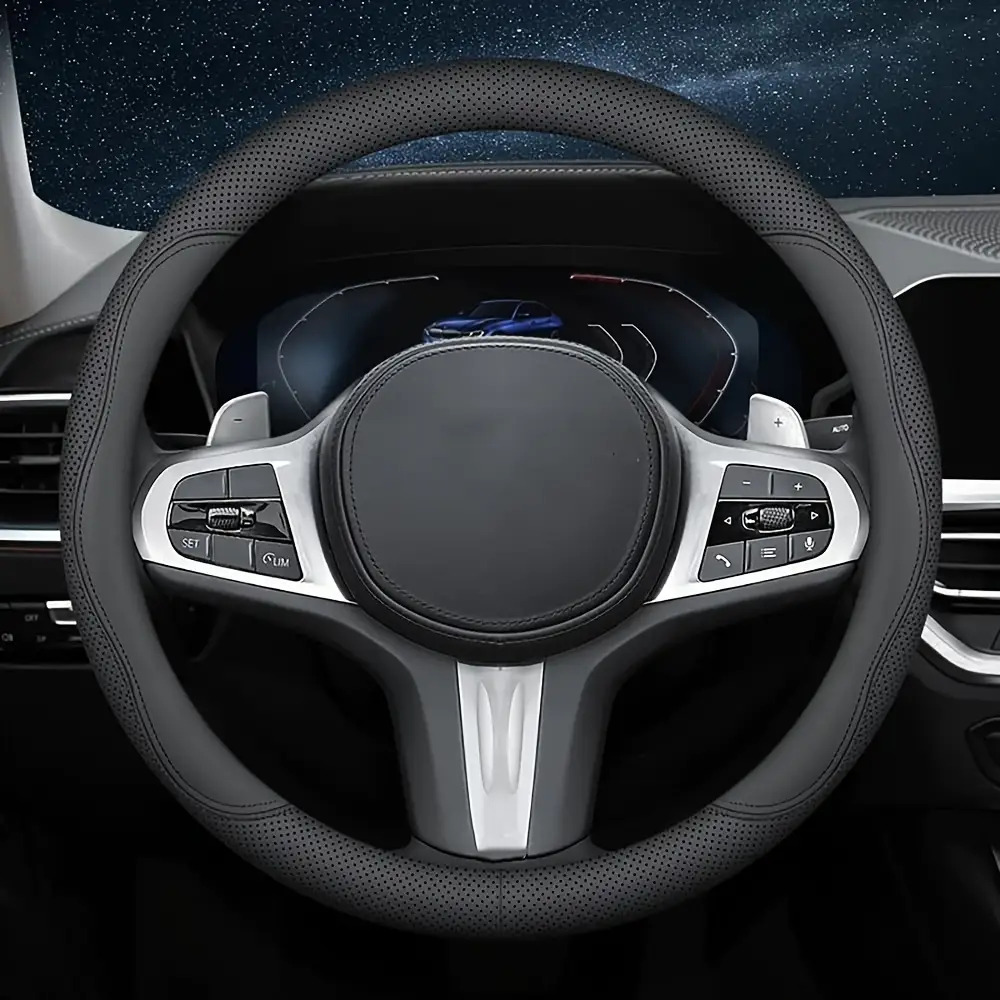 TEMU 울트라 씬 나파 가죽 자동차 스티어링 휠 커버 - 통기성 좋은 15인치 블랙, 인체공학적 디자인과 천공 그립, 대부분의 차량에 적합, 내구성 및 세련된 실내 업그레이드, 차량용 실내 액세서리, 고품질 소재