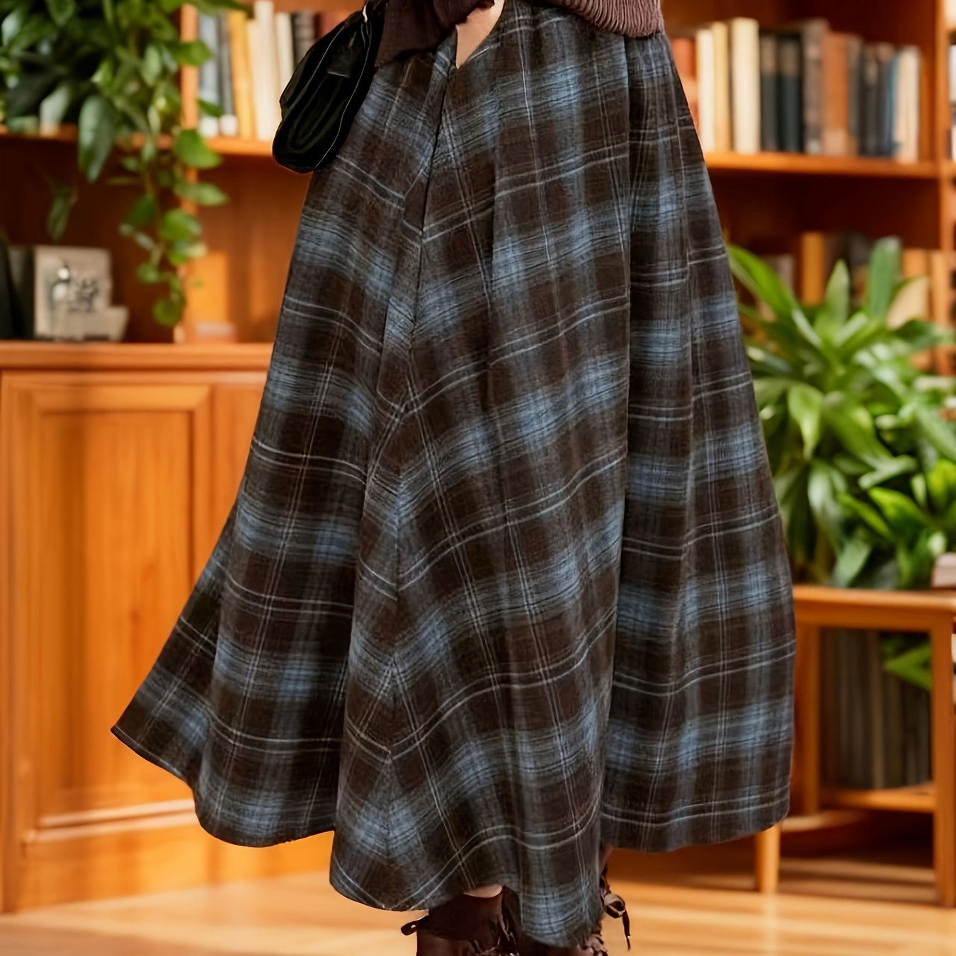 TEMU 여성용 빈티지 브라운-블루 체크 미디 스커트 - 하이웨이스트 A라인 스커트, 데일리웨어 및 캐주얼 룩, 북스토어부터 세미포멀 이벤트까지, 세탁기 사용 가능 (봄 여름 가을) - 모든 하체 타입에 어울리는 논스트레치 스커트