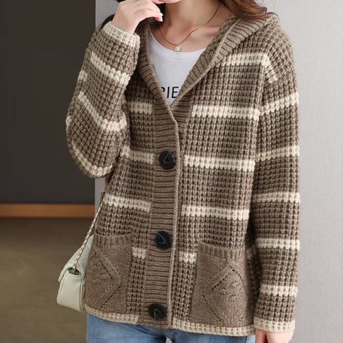 캣 스트라이프 후드 니트 집업 챠콜