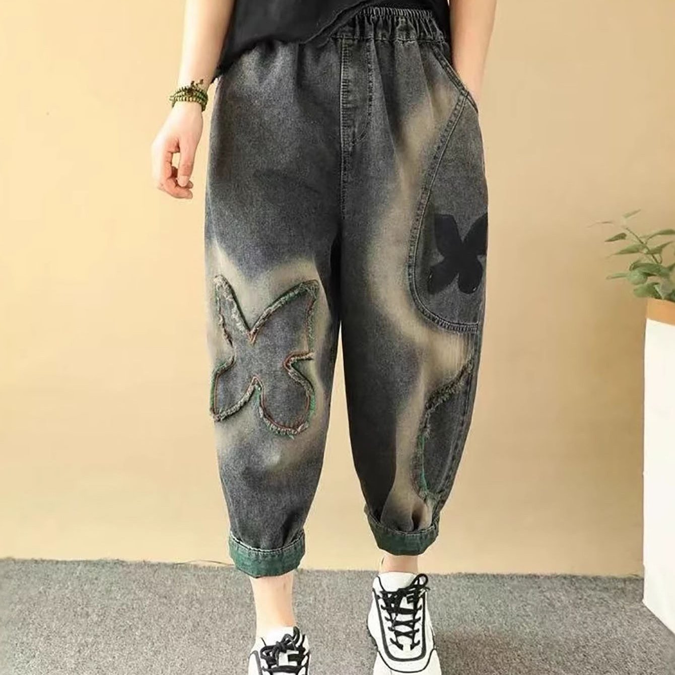 TEMU 여성 신상 자수 빈티지 별 데님 9부 팬츠-가벼운 루즈핏 밴딩 빈티지 9부 청바지