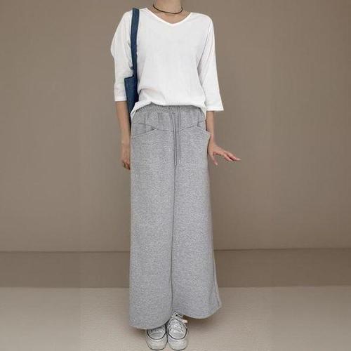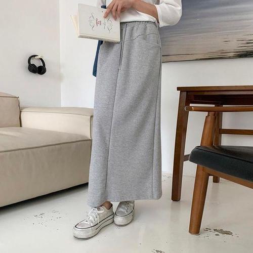 [옷자락] 여성 캐주얼 면 혼합 절개 트레이닝 밴딩 롱 스커트